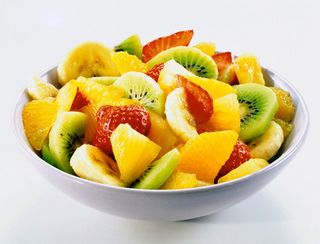 Салат из свежих фруктов, в который добавить по горсти миндаля, проросшей пшеницы, семян тыквы, запить стаканом обезжиренного молока.